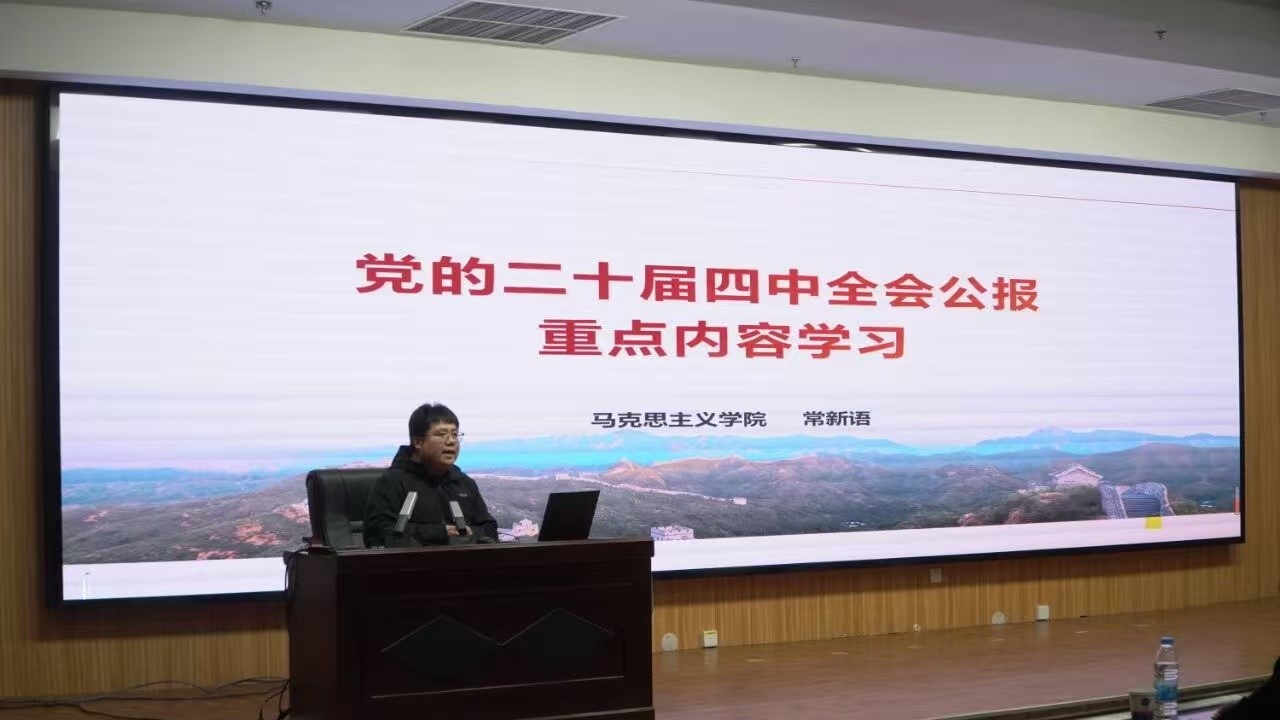 学习会特邀马克思主义学院教师常新语作专题辅导报告,系统解读党的二十届四中全会公报重点内容。报告从充分认识全会的重大意义、深刻领会全会关于“十五五”时期的新思想新论断、牢牢把握高质量发展等方面进行了系统阐释,强调了“十五五”时期在基本实现社会主义现代化进程中的重要地位,并结合我省、我校实际情况引导师生思考如何将全会精神落实到推动地方与学校发展的具体行动中。