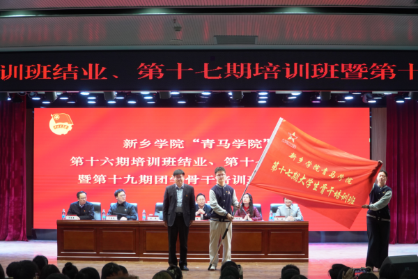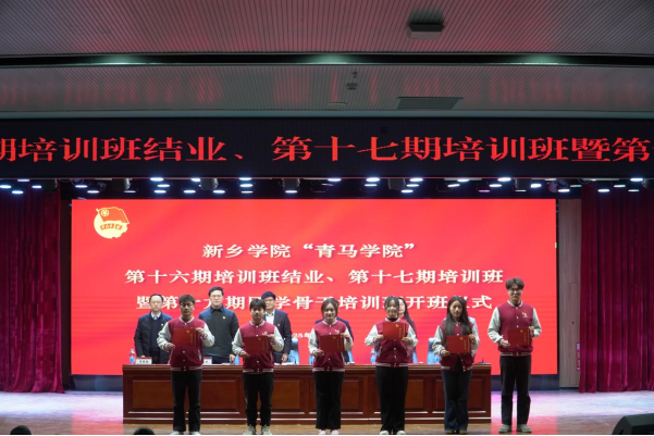 “青马工程”结业暨开班仪式上,第十六期青马班团支书李可欣作结业汇报。随后,与会领导为第十六期青马班学员代表颁发结业证书。沈田青、苏辉分别宣读了《关于举办新乡学院第十七期“青年马克思主义者培养工程”培训班的通知》和《新乡学院“青年马克思主义者培养工程”培训班实施方案》。仪式最后,宋伟为“青马学院”第十七期培训班授旗。