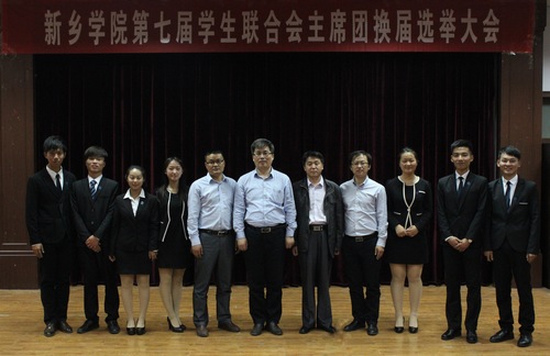 5月11日,新乡学院第七届学生联合会主席团换届选举大会在A-01号楼114报告厅举行。党委学工部部长、学生处处长、校团委书记、学生联合会秘书长欧阳豫樊老师,团委副书记王坤、田文强老师,各院系团总支书记、团委老师、校学生会成员以及社团联合会、青年志愿者联合会、各院系学生代表近300人共同参加此次大会。大会由学生会主席杨振川同学主持。