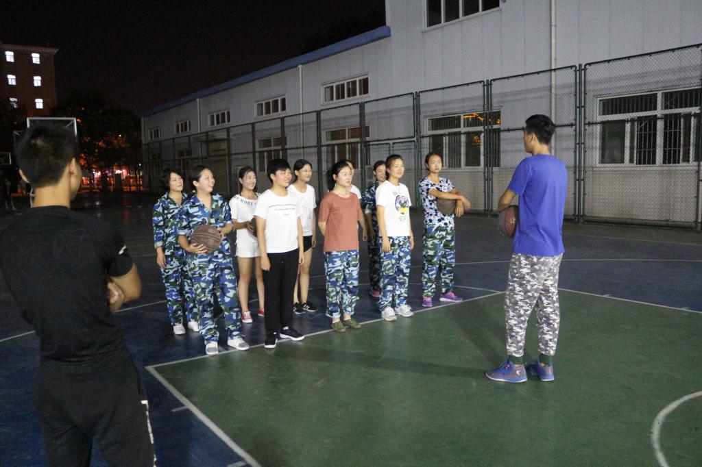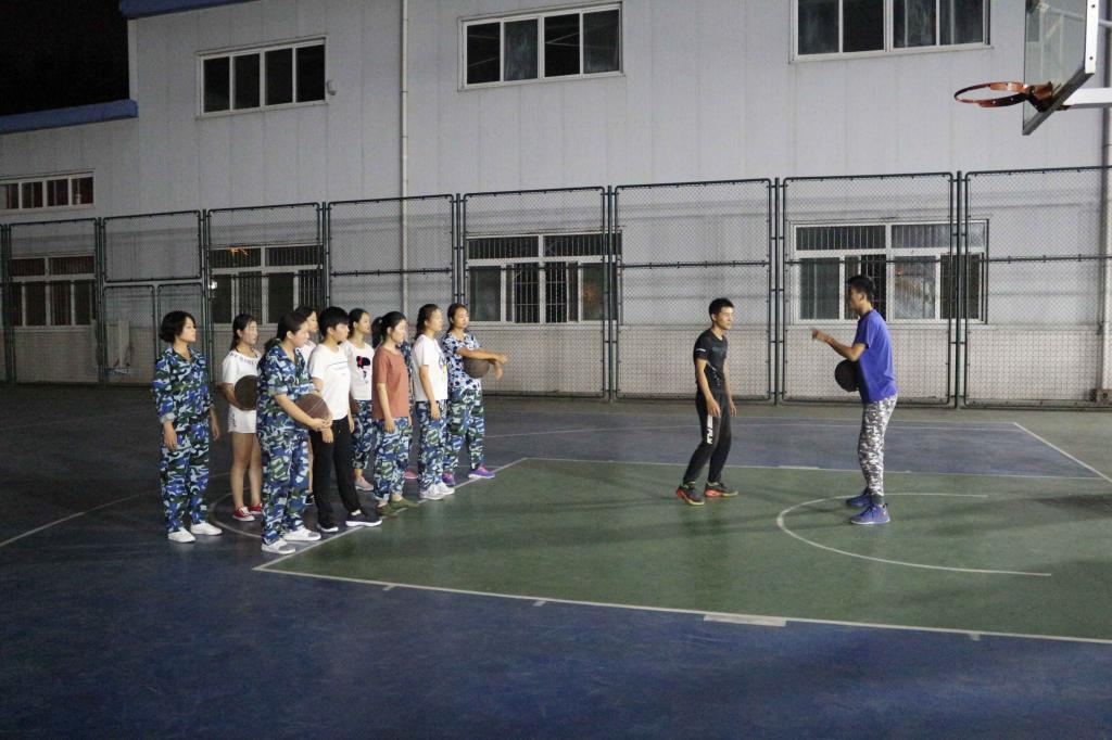 在训练中,女篮篮球队教练悉心讲解,亲身示范,队员们更是认真练习,力求完美。三步上篮,折返跑,一遍又一遍,都化作队员们额头上的汗水,蒸发为他们对篮球的热爱。女篮队长在做好配合教练的教学工作外,更是为队员们做好后援工作,准备矿泉水,湿巾,组织好篮球的放存,为她们加油打气。篮球队队员们状态正佳,不怕吃苦,白天完成好军训之后,更是牺牲课余时间不断加强训练。