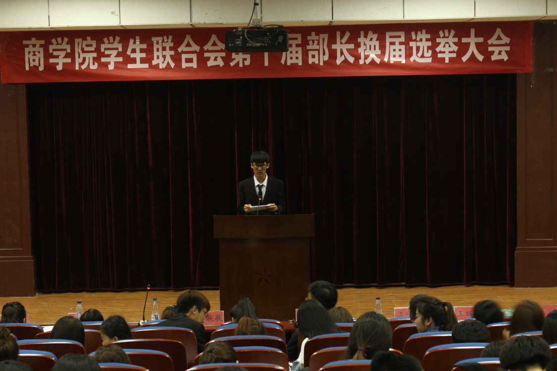 在商学院学生会第十届学生干部任期即将届满之际,为了选拔出新一届品学兼优的学生干部,9月26日下午4点,商学院学生联合会第十届部长换届选举大会在A01-114报告厅举行。商学院团总支书记王鑫老师,商学院各辅导员老师出席了此次大会,并担任评委。观众由商学院学生会主席团,各部门部长及干事,各班班长团支书组成。