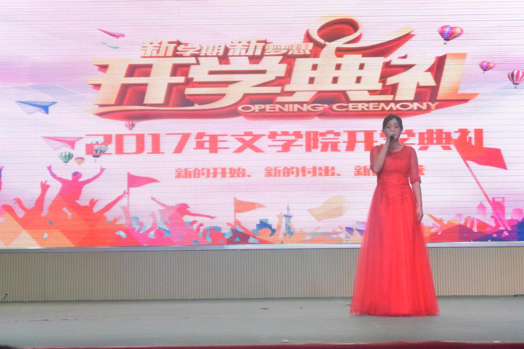 典礼开始前,一段关于文学院各项活动的迎新视频吸引了大家的目光。接下来新院版《成都》、独唱《珊瑚颂》和汉舞表演《礼仪之邦》赢得了大家热烈的掌声。当庄严的国歌肃然奏起,文学院2017级开学典礼正式拉开序幕。院长袁蕾教授首先致辞,她向新生介绍了文学院的师资力量、专业特色、课程设置等,并对新同学提出了殷切期望和要求。接下来老生代表贾宏燕和新生代表王运勃先后作了发言。最后,党总支书记郭明进老师勉励同学们要一直保持学习的状态,珍惜青春、潜心治学、丰富自我。至此,文学院2017级新生开学典礼圆满结束。