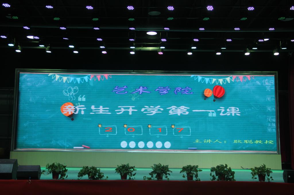为了使艺术学院2017级新生更好的了解和适应大学生活,艺术学院于9月15日晚上七点在西区音乐厅举办了“艺术学院2017级开学第一课”讲座和创新引飞启动仪式活动。艺术学院党总支书记刘河老师、院长耿聪老师、党总支副书记李秀霞老师、团总支书记孟瑶老师、各教研室主任、“创新引飞”导师以及新生辅导员出席了此次讲座。此次讲座由艺术学院党总支副书记李秀霞老师主持。
