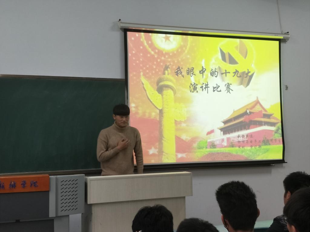 主持人精彩的开场白结束,比赛正式拉开序幕。来自各个班级的12名参赛选手进行了激烈角逐。比赛现场,选手们紧扣活动主题,用最真诚的语言和最真挚的情感表达出内心深处对党的热爱和对祖国的祝福。其中参赛选手华毅还准备了“我眼中的十九大”PPT,他以画面的形式向大家展示了我国从鸦片战争、九一八事变到成为世界第二大军事强国的艰难历程。赛后,物理与电子工程学院学生会组织部部长杨光对此次比赛进行了精彩的点评。最后,演讲比赛在同学们热烈的掌声中圆满结束。