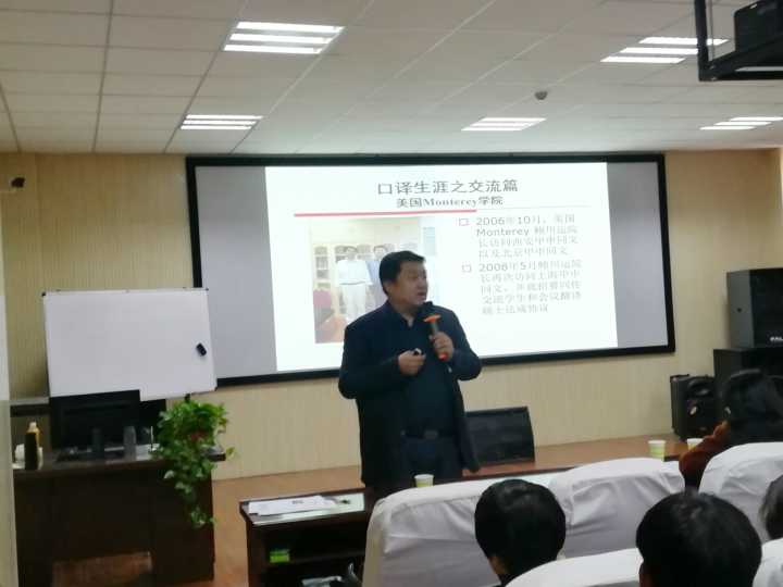 11月14日下午两点半,中国翻译协会翻译能力培训与评估中心主任张雪涛老师应外国语学院之邀,莅临A07-501教室开展题为“口译职业生涯与规划”的讲座。此次讲座由外国语学院副院长李艳叶主持,2015级翻译专业全体学生前来听讲。