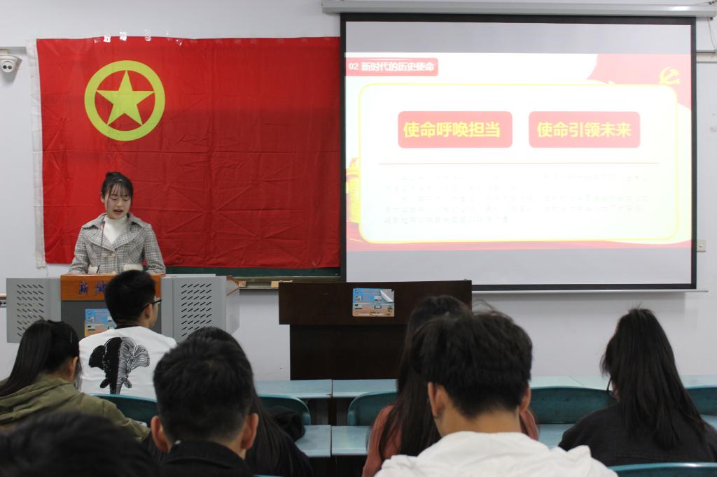首先,李晓聪从总体上介绍了十九大的胜利召开,并强调团员要掀起学习十九大精神热潮。接着她从时代背景、历史使命、基本方略、重要意义四个方面来详细介绍十九大的内容,带领同学们深刻解读了新时代的中国特色主义社会。接下来,她结合当代大学生团员所肩负的使命与责任,向同学们讲述作为优秀共青团员应该从自身做起,加强自身政治理论学习,对同学们提出更高的要求。最后,以一段励志视频结束了此次活动,给予了同学们极大的振奋。