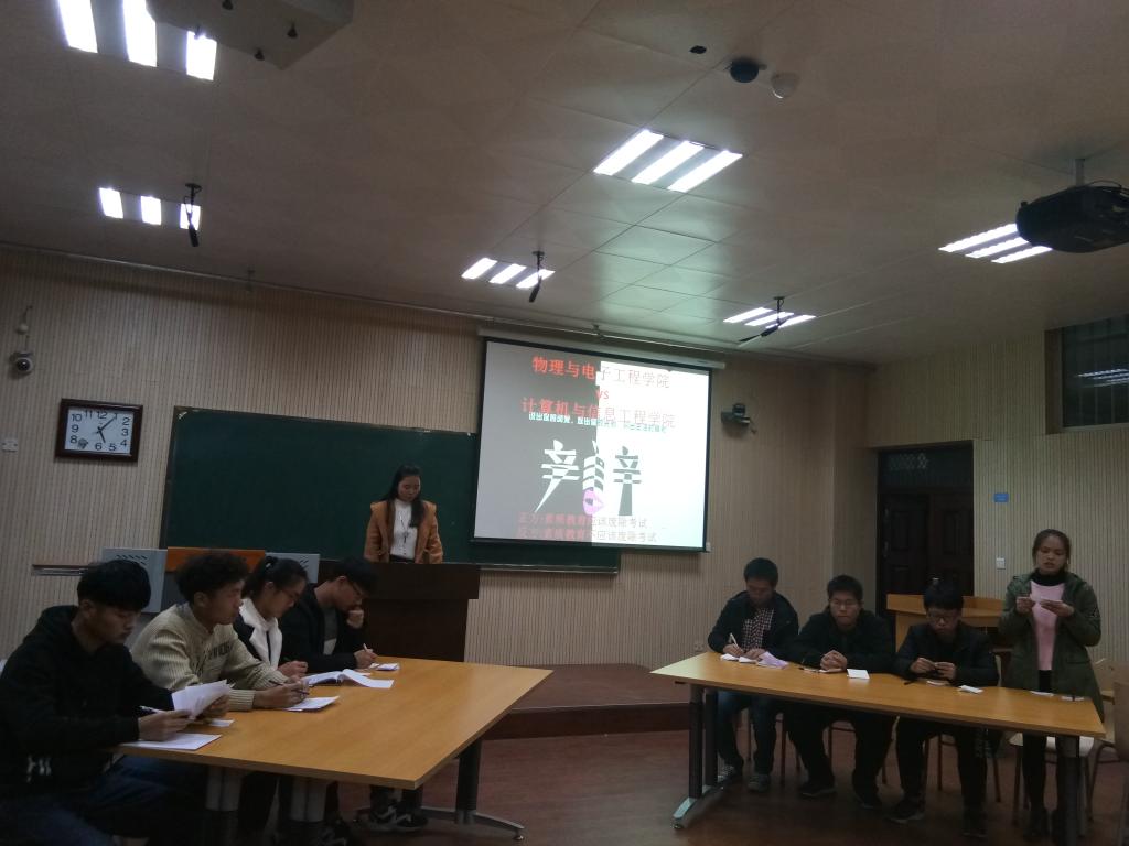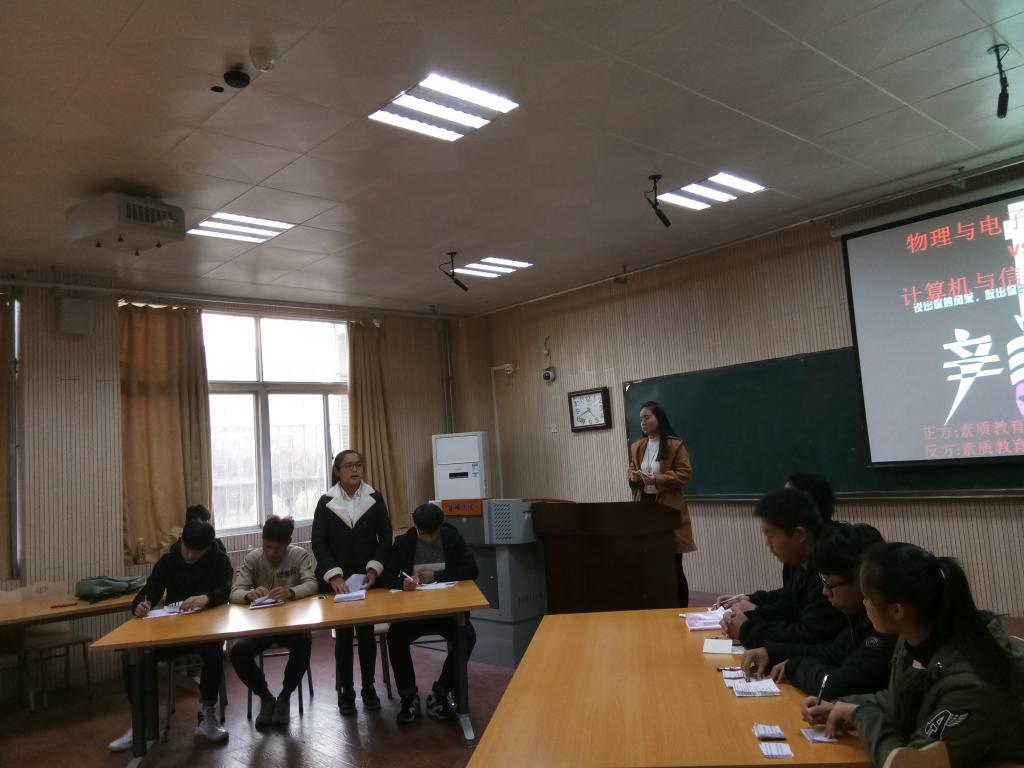 物理与电子工程学院于11月18日下午4:30在A05-103教室举办了一场以“素质教育是否应该废除考试”为主题的辩论赛。参与此次辩论赛的学院有物理与电子工程学院和计算机与信息工程学院。此次辩论赛引起了同学们的广泛关注。