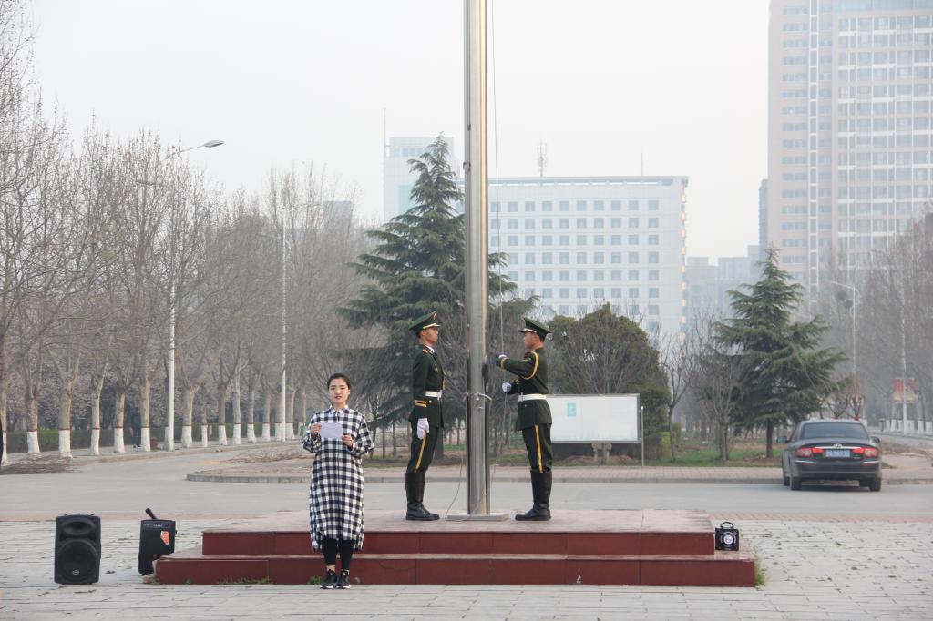 升国旗仪式在早上的七点钟正式开始,先由学生代表刘思颖进行演讲,演讲结束后国旗护卫队的队员们昂首挺胸,迈着铿锵有力的步伐,护卫着国旗出现时,同学们心中对国旗的敬意油然而生。随着国歌响起,国旗护卫队队员威武一挥,在同学们的注视下,鲜红的五星红旗冉冉升起,嘹亮的国歌声中,鲜艳的国旗下,庄严肃穆的氛围中,爱国爱校、奋发图强的情感在每位同学心中激荡。