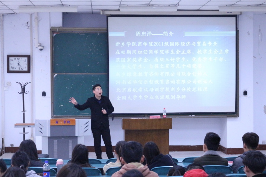 3月20日下午,应商学院之邀,我校优秀校友、河南华信乐智教育咨询有限公司总经理周忠泽在A-05号楼阶梯教室为商学院学生带来了一场题为《我的大学,我的梦;我的未来,我做主》的精彩报告。