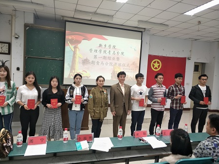 大会在激昂的国歌声中拉开帷幕。首先,第一期青马班班长尹好杰做结业报告,周书记、李书记为第一期青马分院的学员颁发结业证书并由董老师宣读《新乡学院管理学院青年马克思主义者培养学院培养方案》,方案对本期青马班的培养对象、目标、原则、体系、和学员选拔条件五个方面进行了详细的介绍。紧接着,本届学员代表任香宇发言,周书记为本期青马班学员授旗。最后,李书记对本次大会进行总结讲话,勉励青马学员积极投入实践锻炼,做一名优秀的马克思主义者。