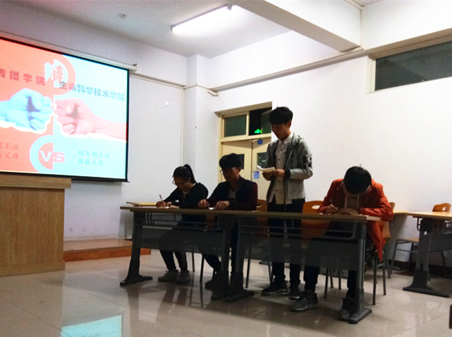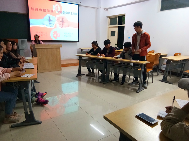 为增强辩手对于辩论技巧的掌握和现场的应变能力,生命科学技术学院与新闻传播学院于4月14日19:30在A14-411举行辩论队友谊赛。担任此次大赛评委的是生命科学技术学院与新传学院学生会各部门部长。