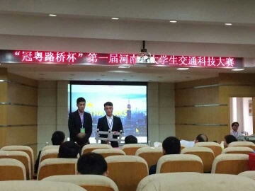 4月14日,河南省第十六届大学生科技文化艺术节“冠粤路桥杯”第一届河南省大学生交通科技大赛在焦作河南理工大学隆重举行,此次大赛由教育部高等学校交通运输类教学指导委员会指导,中共河南省委宣传部、共青团河南省委、河南省教育厅、河南省文化厅、河南省学生联合会联合主办。