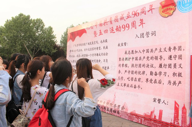 根据时间表的安排,各班团支书按时带领各班同学于国旗广场集合,在工作人员的带领下排队依次在展板前进行宣誓或者唱团歌。大一的团员们高举右手,紧握右拳,郑重地宣誓,宣誓铿锵有力,慷慨激昂。团员们举起的右手紧握的是共青团员的忠诚,专注的目光凝聚着共青团员的坚定。大二的团员们面对歌词,放声歌唱,嘹亮的歌声中升华了共青团员的信仰。广场上回荡的神圣庄严的入团誓词和慷慨激昂的团歌,仿佛又让在场的全体共青团员回到了入团时那令人激动而又难忘的时刻。结束后,同学们纷纷表示作为共青团员要勤奋学习,吃苦在前,享受在后,为共产主义事业努力拼搏奋斗。