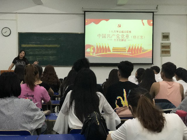 随后,李老师为同学们讲授本期党课第一讲内容《中国共产党章程(修正案)》解读。这一讲主要列举写入党章的十个标题内容,紧跟十九大的步伐。李老师在课上诠释了各知识点,使内容深入人心。同时向大家介绍了入党的流程与条件,党的纪律、方针与政策等,使学生更加了解在大学阶段如何做好一名预备党员,如何开展和积极支持党的工作,如何树立踏实肯干的工作作风,为学生党员的素质及党性修养的提高奠定了坚实的基础。
