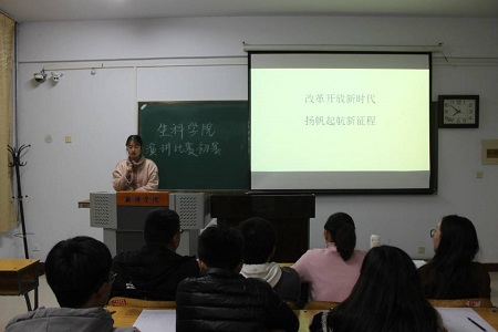 比赛伊始,生命科学技术学院学生会主席介绍了比赛规则和评分标准。参赛同学以当代大学生的视角,图文并茂地展现了改革开放以来党和国家在经济、科技、文化、教育、航空、国防等领域取得的辉煌成就,演讲主题鲜明,感情饱满,材料丰富,立体形象,充分体现了同学们思想上的先进性、认识上的开放性和青春的激情活力。参赛同学激情澎湃的演讲感染了现场每一位评委。评委从演讲内容、语言表达、现场感染力等方面为选手的表现逐项打分,最终八组选手进入了二轮比赛。
