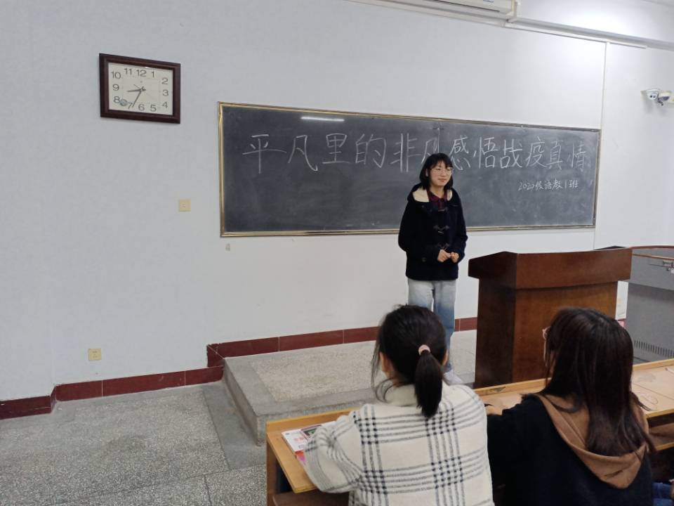 为了让同学们进一步理解学习新思想,争做新青年,人文学院2020级语文教育1班于11月11日晚7点在A01-509开展以“平凡里的非凡,感悟战疫真情”为主题的团日活动,此次活动由团支书张畅畅同学主讲,2020级语文教育1班全体同学参加。