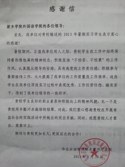 在座谈会上,郑书记首先介绍了此次北戴河暑期社会实践活动的背景。她谈到,在我校“教书育人,实践育人,管理育人,服务育人”四育人体系的大背景下,我院积极组织学生利用假期参加社会实践活动,正是落实我校“实践育人”人才培养方案,发展学生的适应能力、动手能力,提高学生适应社会能力的有效途径,是我院有效开展实践育人的一次尝试和探索。为组织好这次暑期社会实践活动,我院与河南中原青年社会实践研究发展中心暨郑州同心圆教育信息咨询有限公司进行了多次的沟通协商。崔书记和辅导员李卓燃亲自把学生送到北戴河实践基地。李卓燃老师每周与学生定时联系,了解学生的社会实践情况。实践证明,此次北戴河之行取得了良好的效果,华北石油管理局北戴河疗养院给我院寄来了感谢信。