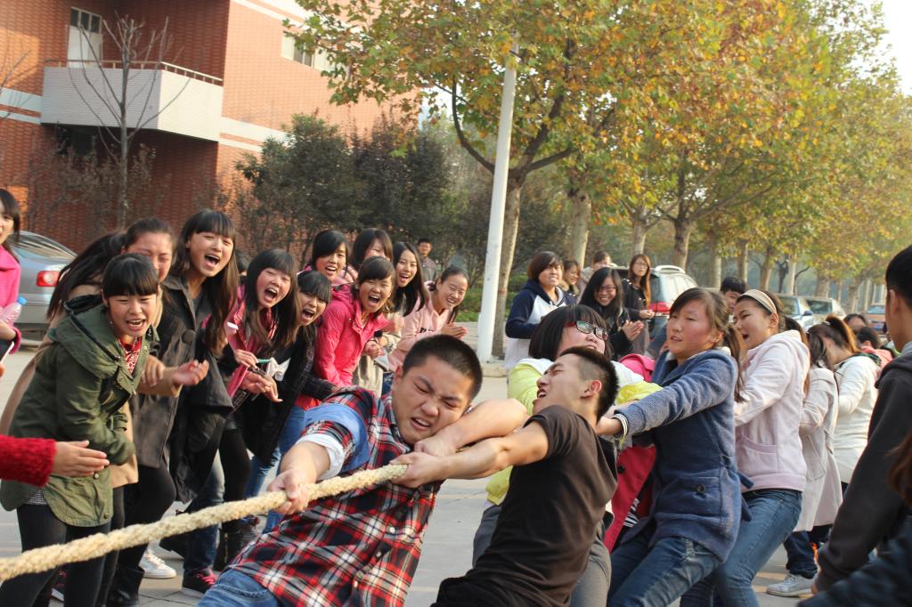 伴随着响亮的哨声,比赛正式开始。比赛场上,三组比赛分队同时进行。现场气氛更是热烈欢乐。同学们都团结一心的为自己所在的分队的奋力。参赛队员们个个摩拳擦掌,使出了浑身解数,表现出了团结拼搏争创佳绩的决心。场外,热情的啦啦队也在两旁为他们加油鼓劲,震耳欲聋的喝彩声和呐喊声此起彼伏。无论在场内还是场外,同学们好像融为了一体。整个比赛处处体现着“友谊第一,比赛第二”的精神风貌。经过几个回合的比赛,最终13级文化事业管理一班代表队以雄厚的实力摘取了此次拔河比赛的桂冠。比赛在一片欢乐的氛围中结束。