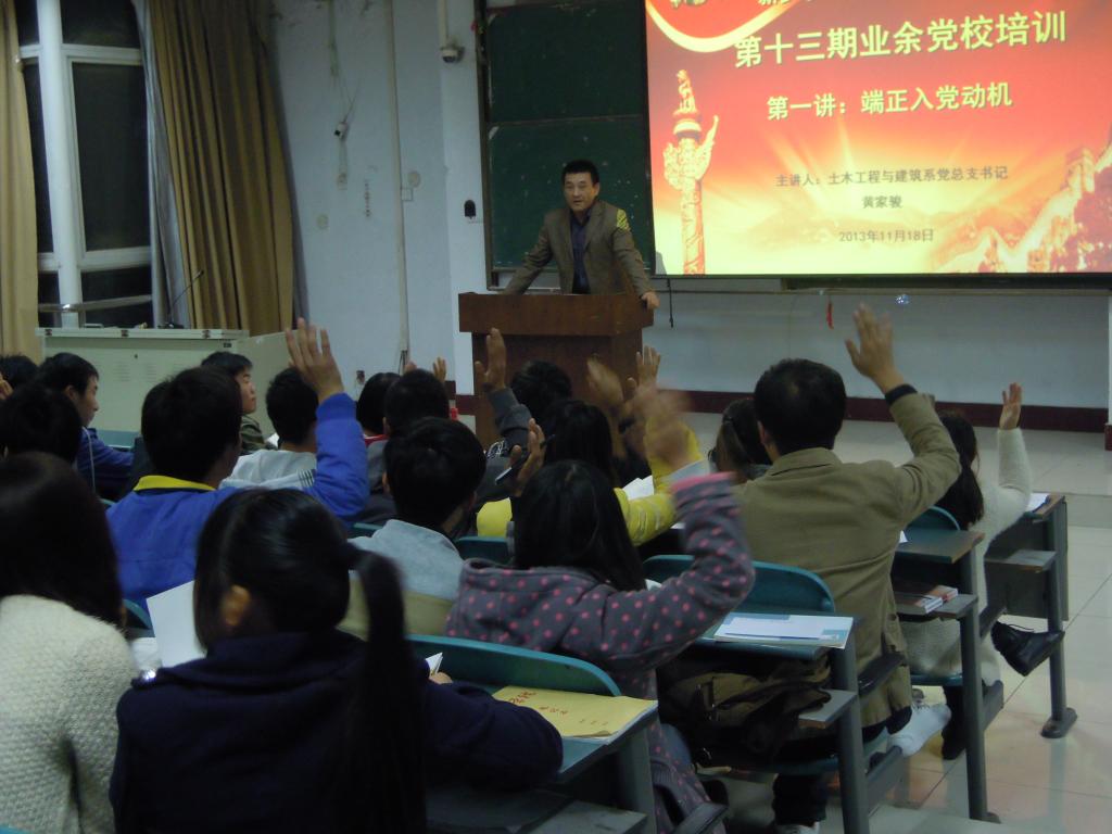 根据学校党委的统一安排,土木工程与建筑系第十三期学生业余党校培训课于11月18日晚6点30分在A—05 0208教室开班第一课。此次党课由土木工程与建筑系党总支书记黄家骏主讲。