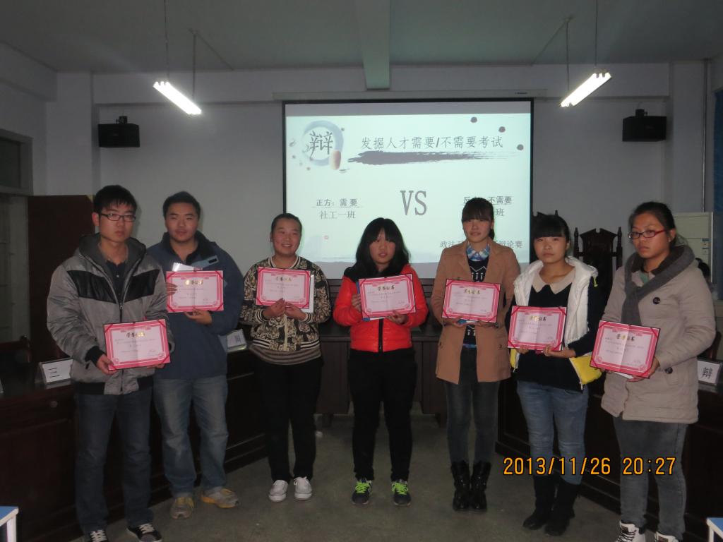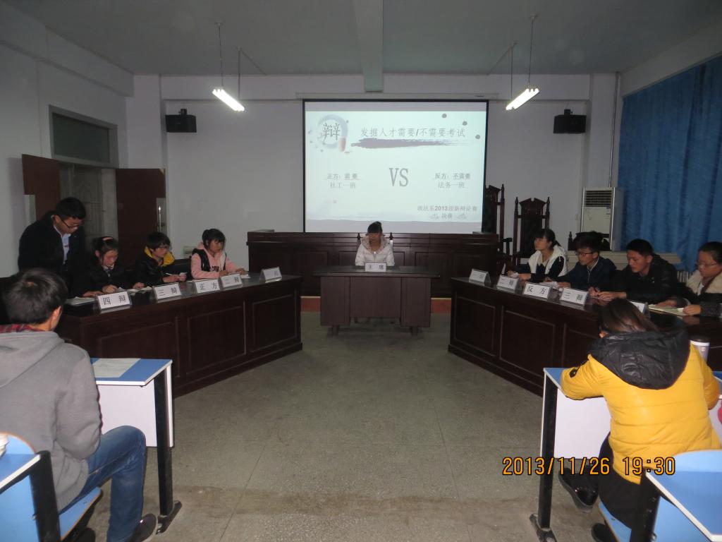 本着“增强团队协作,锻炼思辩能力”的宗旨,政法系迎新辩论赛总决赛于11月26日晚上7时在A-01楼0214教室顺利拉开了帷幕。此次比赛由政法系12级优秀辩手以及学生会干部担任评委,政法系13级学生代表聆听了辩论赛。