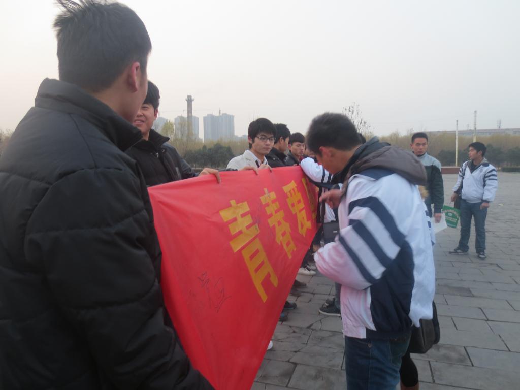 尽管冬日寒风冽冽,但也不能吹灭同学们心中如火的爱国之情。迎着朝阳,首先国旗护卫队的队员护送鲜艳的五星红旗入场。紧接着伴随《义勇军进行曲》的响起,同学们集体行注目礼。冉冉升起的五星红旗激发了同学们的昂扬斗志,点燃了同学们强烈的爱国热情。升旗礼毕,机电工程学院学生代表韩赛威同学在庄严的国旗下发表以“12.9运动”为题的讲话,他慷慨激昂地表达了为振兴中华民族而努力学习的伟大志向,铿锵的话语更是引起了同学们的共鸣,句句深深地烙印在同学们的心上。最后,签名活动为本次升旗仪式划上圆满的句号。