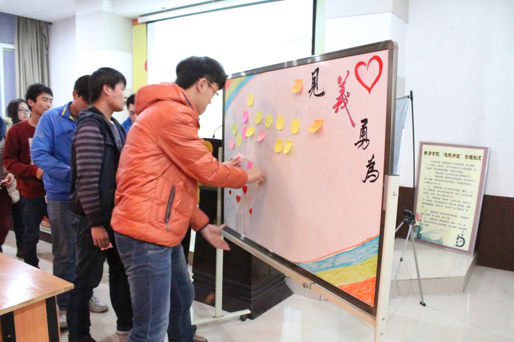 第六期道德宣讲活动主题是见义勇为。主持人以三问自心引领大家进行自我反省,倡导做好事做善事得吉祥。随后,大家一起合唱《学习雷锋好榜样》,欢快的歌曲体现出助人为乐的宗旨。学模范环节,师生们重温了吴菊萍和陈光标的道德模范事迹,通过榜样们传递出的朴实力量,影响自己道德实践。在发感悟环节,许多同学与大家分享了此时的心理感受或是身边的乐于助人的故事,并作出道德承诺。随后,大家一起诵读了《论语》中的经典语句。最后,同学们纷纷在心愿墙上写下了祝福语,祈祷厚德善行,吉祥相伴。主持人提出希冀在座的每一个人怀着一颗感恩的心,贡献自己的力量,每个人做一件好事,帮助身边有困难的人,携手共创道德新院。