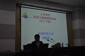 韩教授以义务教育体育与健康教育课程标准为主题进行,主要围绕国家课程标准,基础教育课程改革的具体目标,体育与健康课程标准,义务教育体育与健康课程标准的结构这四个方面由片到全,由点到面对主题进行诠释。在讲座中教授积极与同学互动,向同学提问,并设计有趣问题与同学交流。同学也积极响应,气氛融洽。互动时同学们结合所学知识与经验回答,教授以事例来对同学回答过程中的问题进行解答,会场不时发出热烈的掌声,使会场学习互动热烈高涨。最后,韩教授在在热烈的掌声中结束了此次讲座。