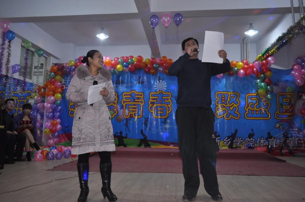 晚会于下午六点三十开始。首先进行的是B-BOX表演,表演者以精湛的技艺征服了全场,赢得观众阵阵喝彩。后续有进行了歌曲、武术、小品等更加精彩表演,观众喝彩和声掌声不断。主持的精彩报幕,观众的热情,音响师的完美调音,都为此次晚会增添完美的一笔,尤其强调的是,体育系孟书记和范老师合唱一曲,使在场所人员为之呐喊,为之疯狂,纷纷跑上前去与老师深情的拥抱。晚会在一派欢声笑语中结束。