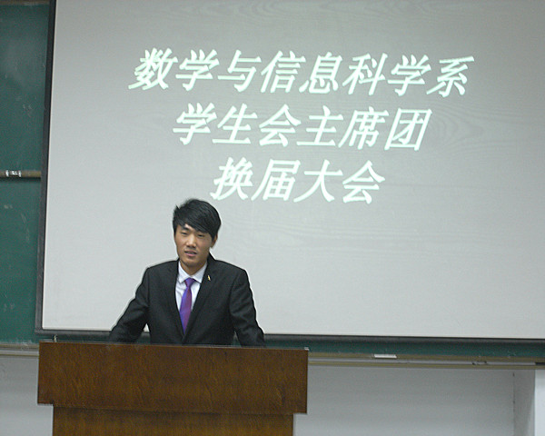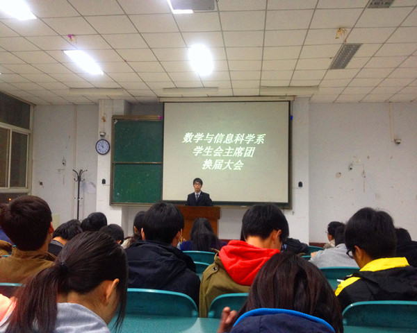 2014年3月1日,数学与信息科学系在A05-308举行了“数学与信息科学系学生会主席团换届大会”此次活动由邱运博主持。王靓、杨艳老师及全体学生干部参加了此次活动。