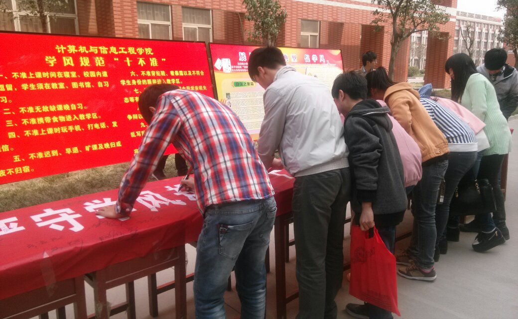 接着,举行了“学风规范‘十不准’学生签名活动”,在由学生代表宣读了《计算机与信息工程学院加强学风建设“十不准”倡议书》后,来自各年级、各班的主要学生干部代表首先在倡议书上进行了签名, 18日,计算机学院将在充分发动的基础上,继续在A14楼前举办院系全体学生签名活动,进一步全面发动,广泛宣传,在全院师生中营造积极的学风创建活动氛围。组织开展签名活动旨在引导同学们树立严于律己、积极带头、做好表率、全力配合学院学风建设的决心。