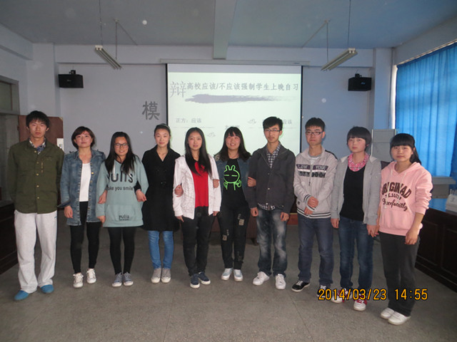 为丰富同学们的课余生活,锻炼他们的思辨能力,3月23日下午2时,政法系与历史系在1号楼0214教室举行友谊辩论赛,正方为历史系专业代表队,政法系代表队为反方,双方就“高校应不应该强制学生上晚自习”这个辩题展开激烈的讨论。