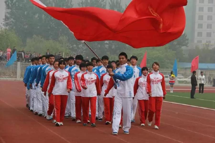在国旗方阵、会旗方阵、鲜花方阵之后是由体育系教师及学生所组成的裁判员代表队,他们力求在比赛中公平公正。之后各院系方队依次从田径场上的主席台前走过,最后是由体育系学生所组成的方队,他们身着系服、步伐整齐、精神抖擞,旗手挥动着系旗,洋溢着青春的活力。这种精神面貌让观看的学生不禁眼前一亮,充分展现了体育系独有的风采。