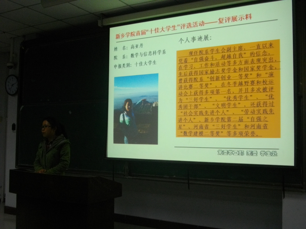 4月21日晚,新乡学院首届十佳大学生报告会于A05-101报告厅准时召开。此次报告会由化学与化工学院、数学与信息科学系、历史系、国际教育与交流中心联合主办。参加此次报告会的有荣获十佳大学生称号的化学与化工学院的宋梦玲、数学与信息科学系的高亚丹、历史系的刘莊,化学与化工学院团副张晓以及13级各班班干也参加了此次报告会。