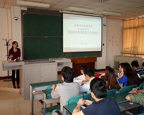 为了让2014届毕业生更顺利地办好离校手续,愉快地走向职场,5月9日,数学与信息科学系在A-05-305举行了2014届毕业生就业指导与离校前工作安排会。参加本次活动的有党总支副书记苏辉,毕业生辅导员毛群英老师,就业秘书王靓老师。