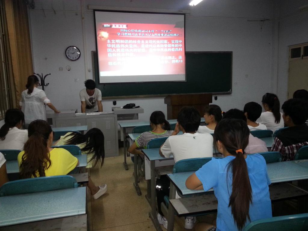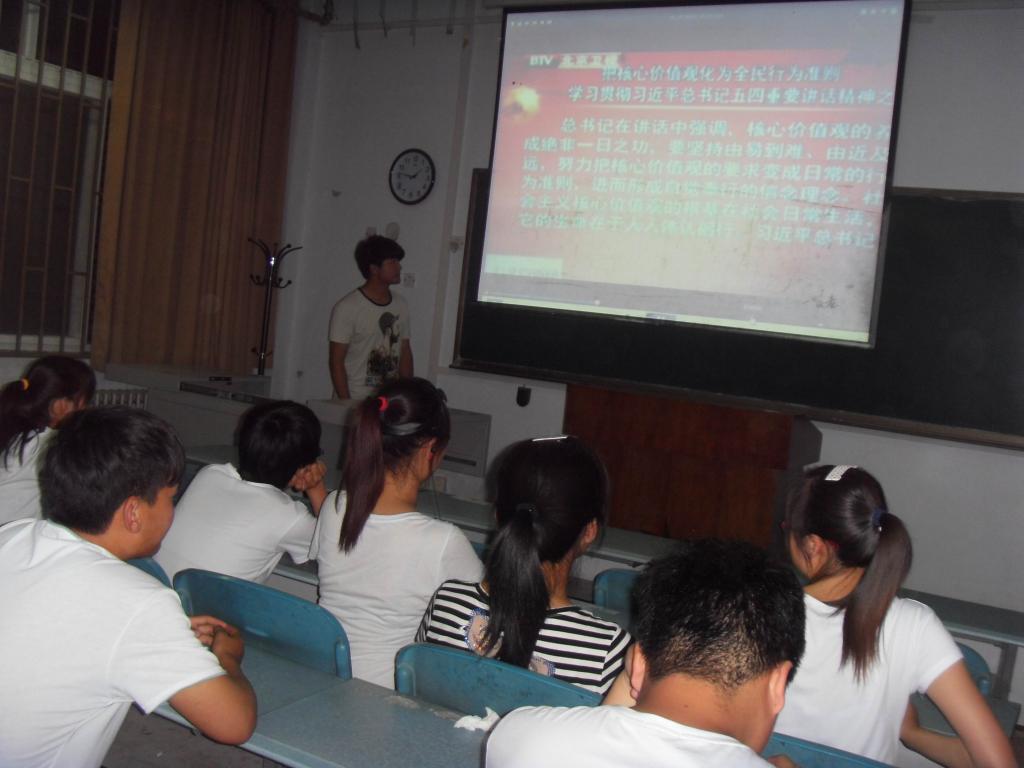 在此次座谈会上播放了习近平总书记在北大讲话的视频,片中习总书记援引古今,出入六经四部,辞气恳切,洒洒万言,是同学们颇为收益。这篇讲话,既体现了习近平总书记学养渊深的传统文化修养,也展示了他对中国传统文化“体贴入微”的认同态度。其中也阐述了很多名言所要表达的真理,同时,习近平总书记也给青年学生提出了四点希望:一是要勤学,下得苦功夫,求得真学问;二是要修德,加强道德修养,注重道德实践;三是要明辨,善于明辨是非,善于决断选择;四是要笃实,扎扎实实干事,踏踏实实做人。他还教导学生:“核心价值观的养成绝非一日之功,要坚持由易到难、由近及远,努力把核心价值观的要求变成日常的行为准则,进而形成自觉奉行的信念理念。”这些让学生们明白了自己应该怎样和国家命运结合在一起,同时,明白自己应该怎样从实际出发,肩负起国家的未来命运。