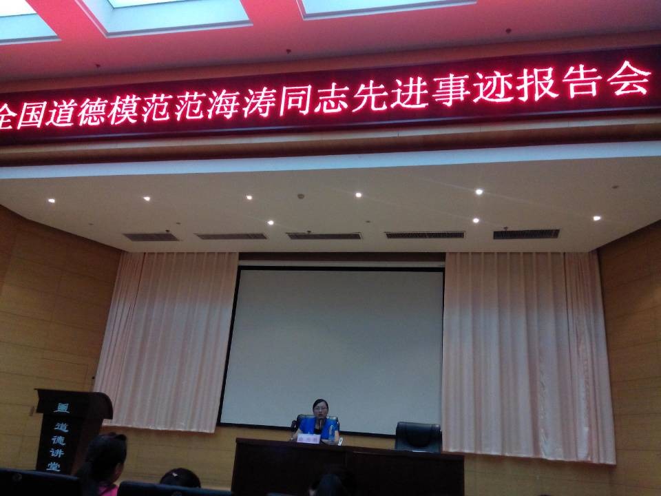 报告会上,孟电集团总经理办公室主任鹿秀辉首先介绍了范海涛同志的工作经历。范海涛同志2001年前在公安系统任职和工作,2001年3月任孟电集团总经理,任职以来对企业和当地发展做出了突出贡献。报告会主要介绍了范海涛同志的先进事迹,如:投身于孟电集团的建设,吃住在工地上;积极响应国家节能减排号召,为我国节能减排工作出力;建立“南李庄幸福院”社区养老院;出资金1.6亿元,为全村村民每户无偿建设一套复式叠加别墅,实现当年入住等一些关乎民生的事情。范海涛同志工作认真负责,很好地践行了党的群众路线,彻底改变了南李庄村的贫困面貌,帮助村民过上了幸福生活。范海涛同志也曾于2010年和2013年分别获得过“全国劳动模范”和第四届全国道德模范等众多荣誉称号。