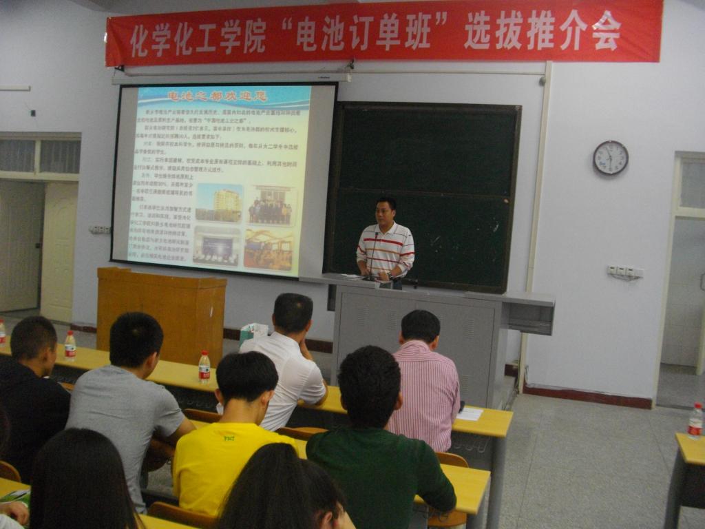 为了使化工学子学到更多与电池企业对口的专业知识, 9月13日下午,化学化工学院于1号楼523教室举办了化学化工学院“电池订单班”选拔推介会,莅临此次大会的有化学与化工学院党总支书记张启中、副书记王新生以及陈磊山博士,同时吕林艳、赵凤梅、张亚昆等辅导员老师和13级化学与化工学院的全体同学也参加了此次大会。