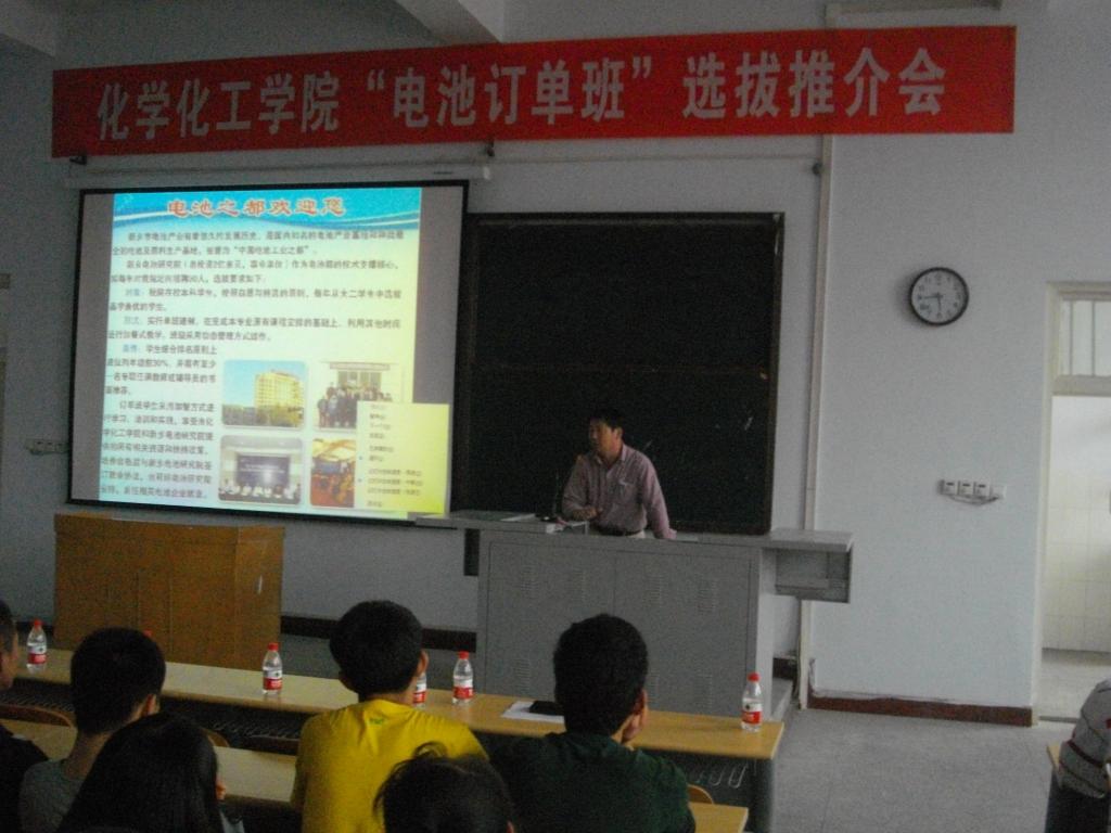 下午5点20大会正式开始,首先王新生书记对出席此次大会的领导及大会内容作了简单介绍,接着陈博士针对电子订单班的目的、订单班的好处以及如何办好订单班三个方面作了精彩讲话,他指出电子订单班由新乡市政府、电池企业及新乡学院共同介入,进行加餐式学习,订单班要求严格,条件苛刻,并对通过考核的毕业生安排就业工作,望大家积极参与;在此基础上,张启中书记指出此次订单班选拔机会难得,望化工学子抓住机遇、当机立断,抓紧报名,并要求加快对订单班的安排,抓紧时间开课。大会的最后环节为疑难解答,同学们积极提问,陈博士也做出了相应的解答,并且吕老师解说了参加此次“电池订单班”的时间、及参加方式。