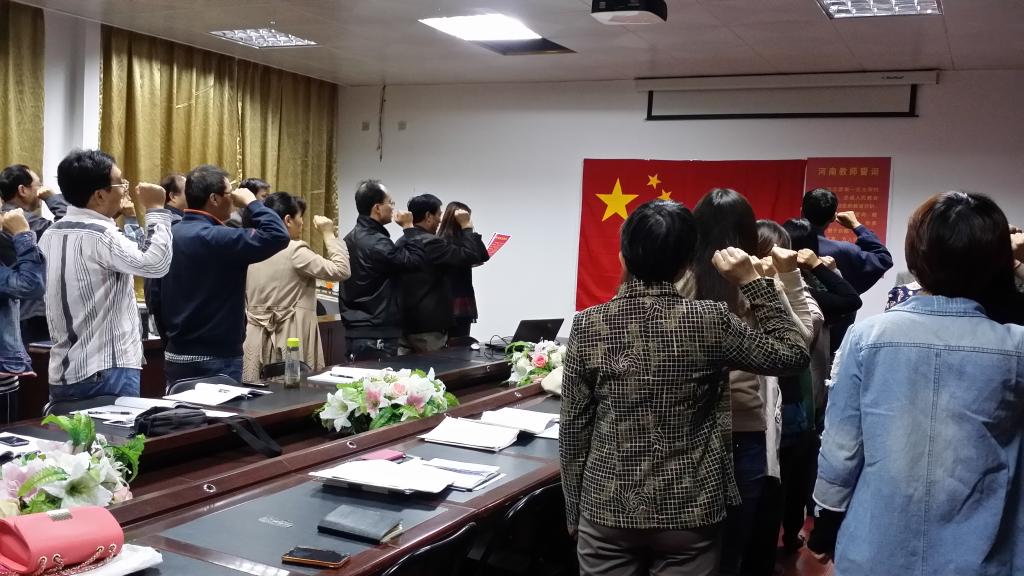 首先,郭兵书记传达了河南省教育厅关于印发《河南教师誓词(试行)》通知的精神,介绍了此次大会的目的和意义,从教育事业到每个教师从事教育教学的准则,从广大教师的理想信念到身体力行的教学实践,从教师誓词所蕴含的精神到践行社会主义核心价值观,深入浅出,耐人回味。接着,郭兵书记带领所有教师面对国旗进行了庄严的宣誓,把会议推向高潮。最后,郭兵书记给大家提出了希望和要求,希望广大教师要认真贯彻党的教育方针、忠诚人民教育事业,要爱岗敬业、教书育人、关爱学生,争做师德师风活动的楷模。