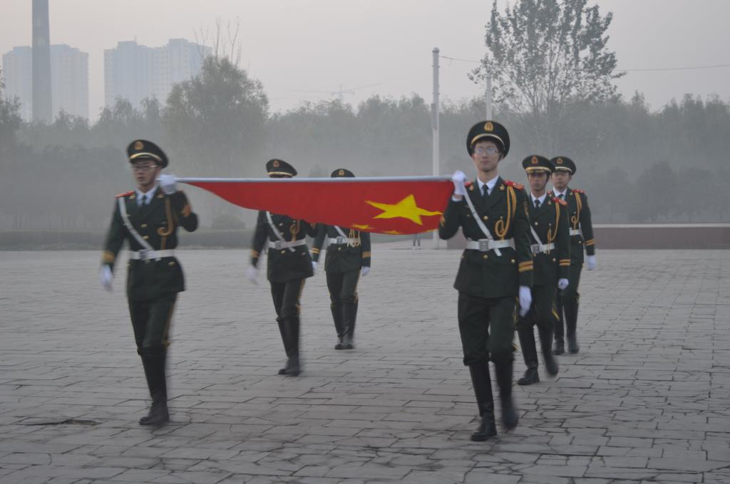 当国旗班同学昂首挺胸,迈着铿锵有力的步伐,护卫着神圣的国旗出现时,同学们心中对国旗的敬意油然而生。紧接着,国歌雄壮响起:“起来,不愿做奴隶的人们……”,伴随着国旗班礼兵威武一挥,那抹晨曦里最耀眼的红色伴随朝阳冉冉升起,飘扬在新乡学院上空。