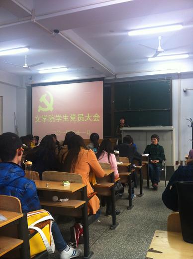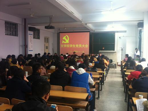 11月21日下午,文学院学生党支部在A01-0513教室召开了发展学生党员和预备党员转正大会。文学院学生党支部书记韩辉、团总支书记崔红志、全体辅导员及学生党员、发展对象参加了本次会议。