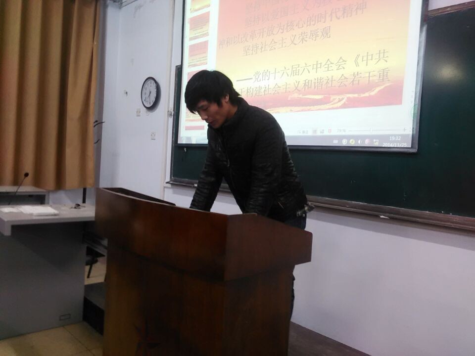 为让大学生更好地认知树立社会主义核心价值观的重要性,化学化工学院于11月25日在A15-121教室参加了由校团委主办、校广播站承办的“实践社会主义核心价值观”的主题演讲比赛初赛。化学化工学院党支部书记张启中、副书记王新出席了此次比赛。方耀老师携学生干部等10人担任此次比赛的评委。