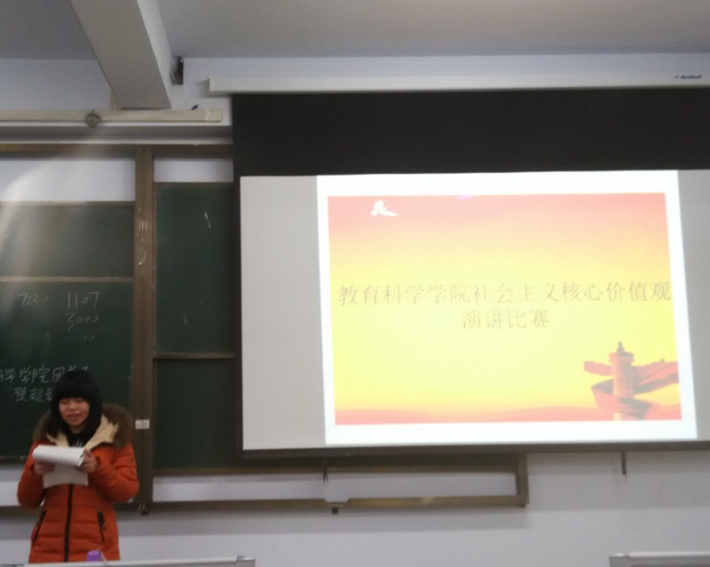 为更加深入学习和践行社会主义核心价值观,引导学生正确的价值取向,提升思想素质。教育科学学院于11月27日晚7点在A11-214教室举办了“社会主义核心价值观”演讲比赛。