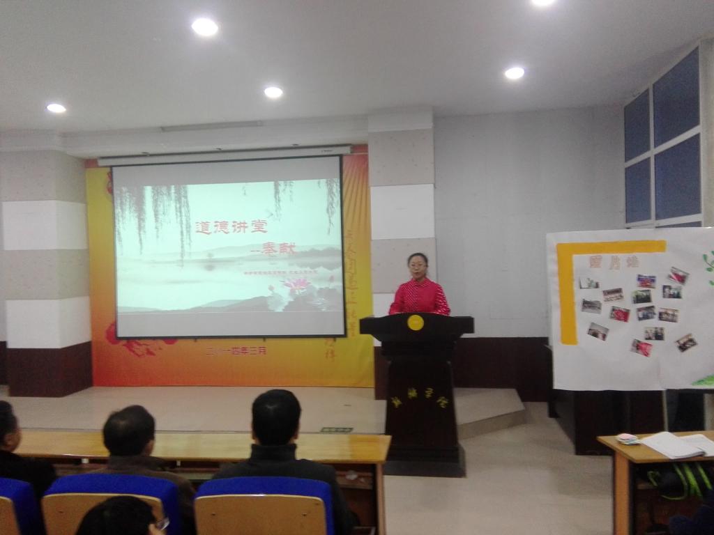 道德讲堂以“身边人讲身边事、身边人讲自己事、身边事教身边人”的形式,传播凡人善举。此次道德讲堂共分为《自我反省》、《唱道德歌曲》、《学习道德楷模》、《发心灵感悟》、《颂道德经典》、《行崇德礼》、《送吉祥》和《一堂一善事》八个环节。师生们通过图片、视频、演讲、师生互动等方式学习先进模范雷锋、郭明义、大学生村官、鹦哥岭志愿服务队的无私奉献的事迹,更加深刻地理解奉献的涵义。
