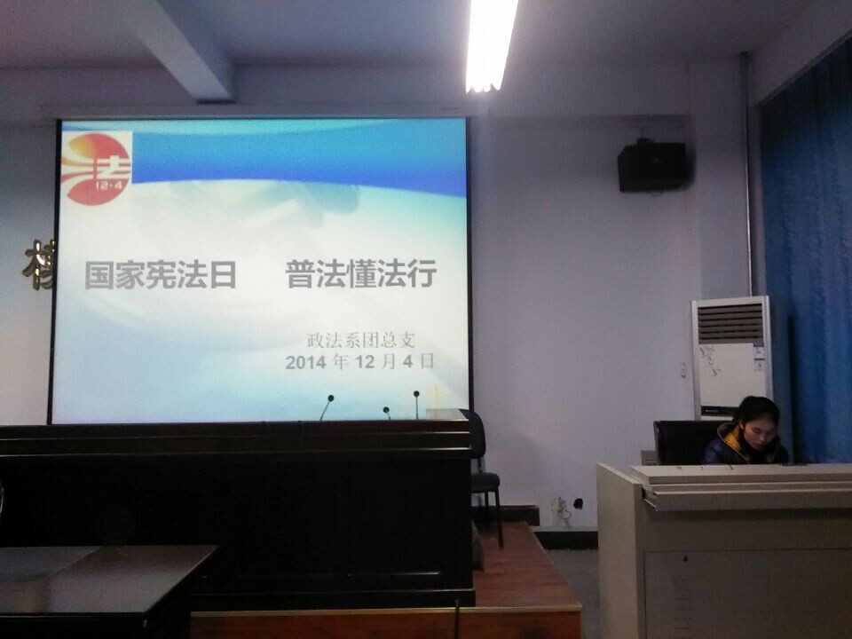 为了弘扬法治精神,增强同学们的法律意识,政法系14级社会工作全体同学于12月4日晚19时在A01-0214模拟法庭召开了“国家宪法日 普法懂法行”主题班会。13级法律事务的学生代表也参加了此次班会。
