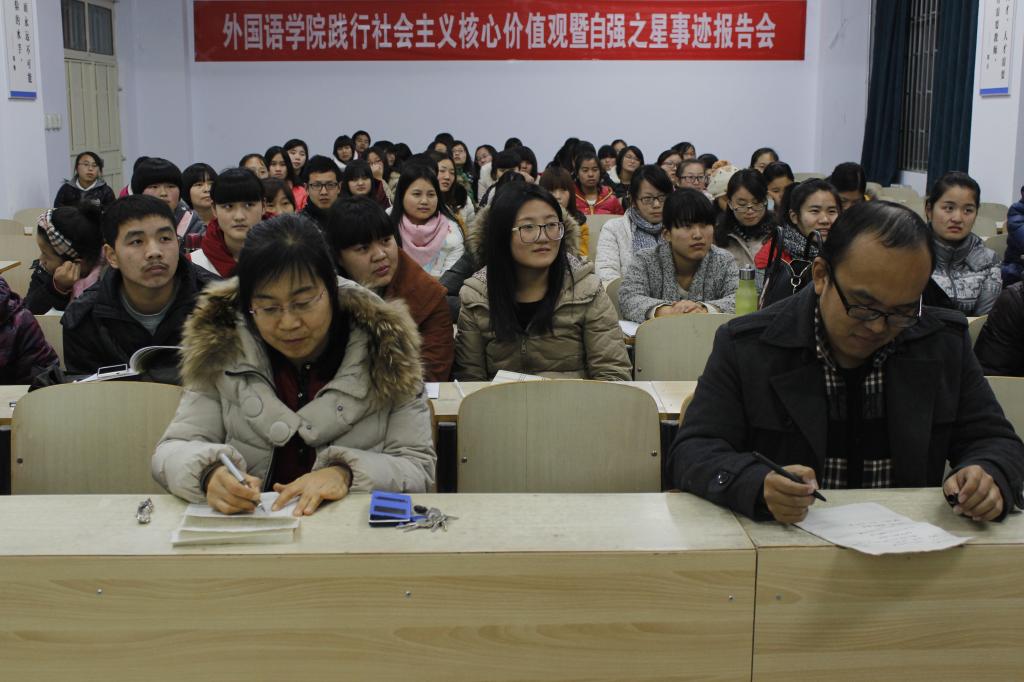 为了深入挖掘和宣传我校大学生中不畏困难,自强自立,积极向上的动人事迹,树立先进模范,教育和引导广大青年学生践行社会主义核心价值观,外国语学院于12月5日下午17点在A11楼313教室开展了社会主义核心价值观自强之星事迹分享会。