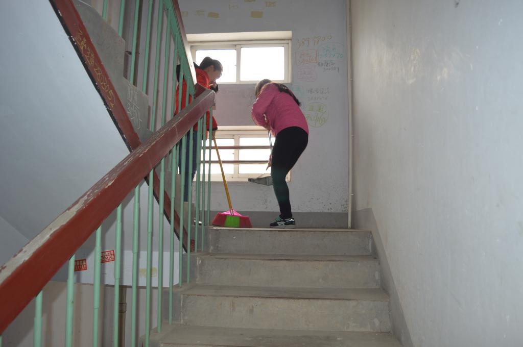 早晨,学生们自带了水桶、抹布、扫帚和拖布等清扫工具,他们分工明确,相互配合的从楼道的高层向下层清扫,并对地面进行洒水和拖擦。学生们的积极性特别强,扫楼梯的扫楼梯,擦栏杆的擦栏杆,合作完成。他们认真仔细的把隐藏在楼道死角的垃圾清理干净,并且把栏杆上、墙上的小广告也处理的一干二净。此次活动同学们热情积极,不怕苦,不怕累,不怕脏,任劳任怨,为大家创建了一个干净美丽的生活环境和文明校园。