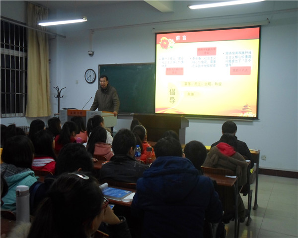 为增强当代大学生社会主义核心价值观意识,积极践行社会主义核心价值体系,提高其自身道德修养,数学与信息科学学院于12月19日下午18:00在A-03-103教室举办了“大学生社会主义核心价值观培育与践行”的主题讲座。