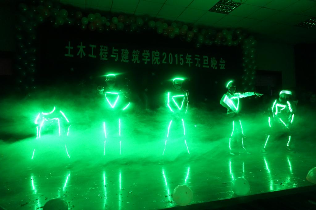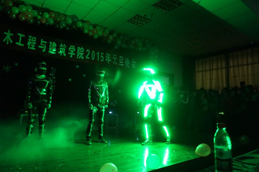 在12月22日晚7时,土建学院的一场别具特色的元旦晚会让在场师生都为之惊叹,其中一段LED灯演尤为凸显。土建学院学生会文艺部的部员们穿上了从网上购置的LED灯套服出演,又是机械舞,又是小苹果的,震撼了全场观众,“那时全场的灯光忽然灭了,我当时还没搞清楚什么情况,还以为学校又断电了。”一位当时在场的2014级土木工程专业的学生说。而之后,一位闪着绿光的学生的登场让全场气氛瞬间沸腾,为留住这神奇的一刻,场下学生也纷拿起手机相机拍照。之后的表演也非常顺利,小苹果的舞蹈配合着LED灯尤为契合。“晚会最让我印象深刻的就是那个LED的表演。”学生孙帅军回忆道,“当时那灯管缠绕着全身,泛着绿光,在黑暗中特别得美。”