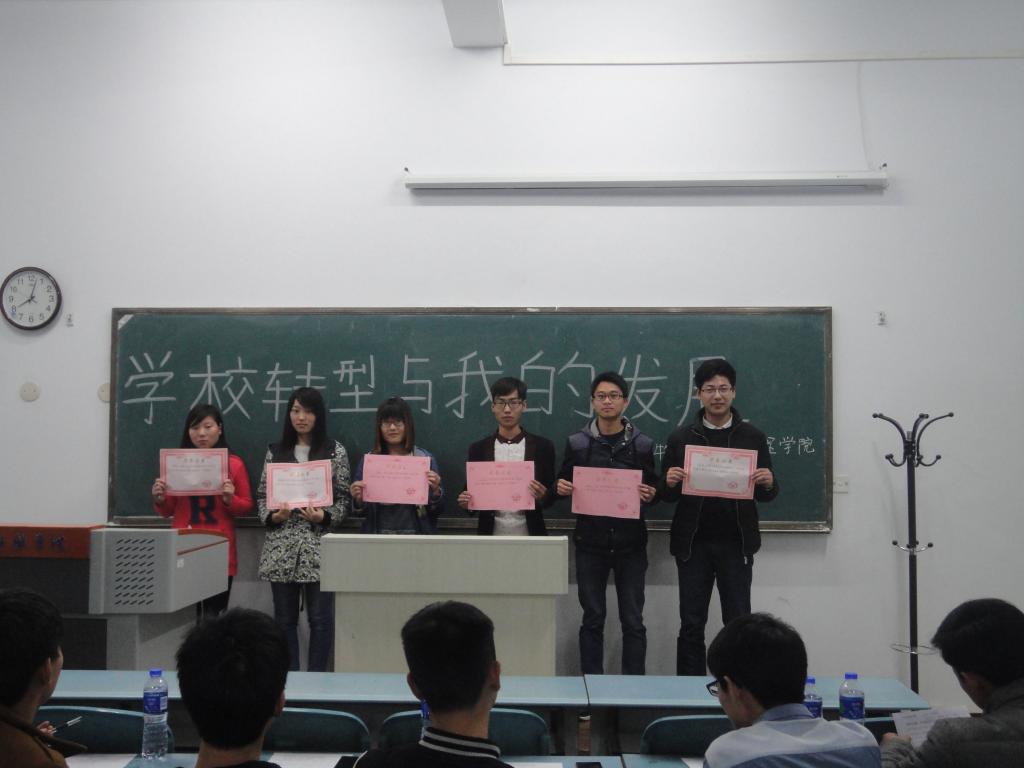 此次比赛旨在给物理与电子工程学院的同学敲响警钟,让同学们能够了解就业形势的严峻,进而可以配合社会需要给自己制定合理的目标,使自己能够在今后的就业竞争中脱颖而出。在热烈的掌声中,主持人宣布了比赛的评分制度。接着各位选手按抽签顺序依次演讲。选手们沉着冷静,演讲时慷慨激昂,从各方面分析了就业问题以及大学生的不足,阐述了学校转型的意义。最后由副主席对活动做了总结,进一步强调了学校转型和规划自身发展的重要性,并对获奖选手进行颁奖。